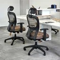 Silla operativa con respaldo en red, asiento tapizado eco cuero o marathon y apoyabrazos regulables. Sistema synchron y regulación en la zona lumbar.