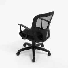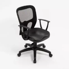 Silla operativa con respaldo en red, asiento tapizado eco cuero o marathon y apoyabrazos fijos. Base estrella negra plástica.